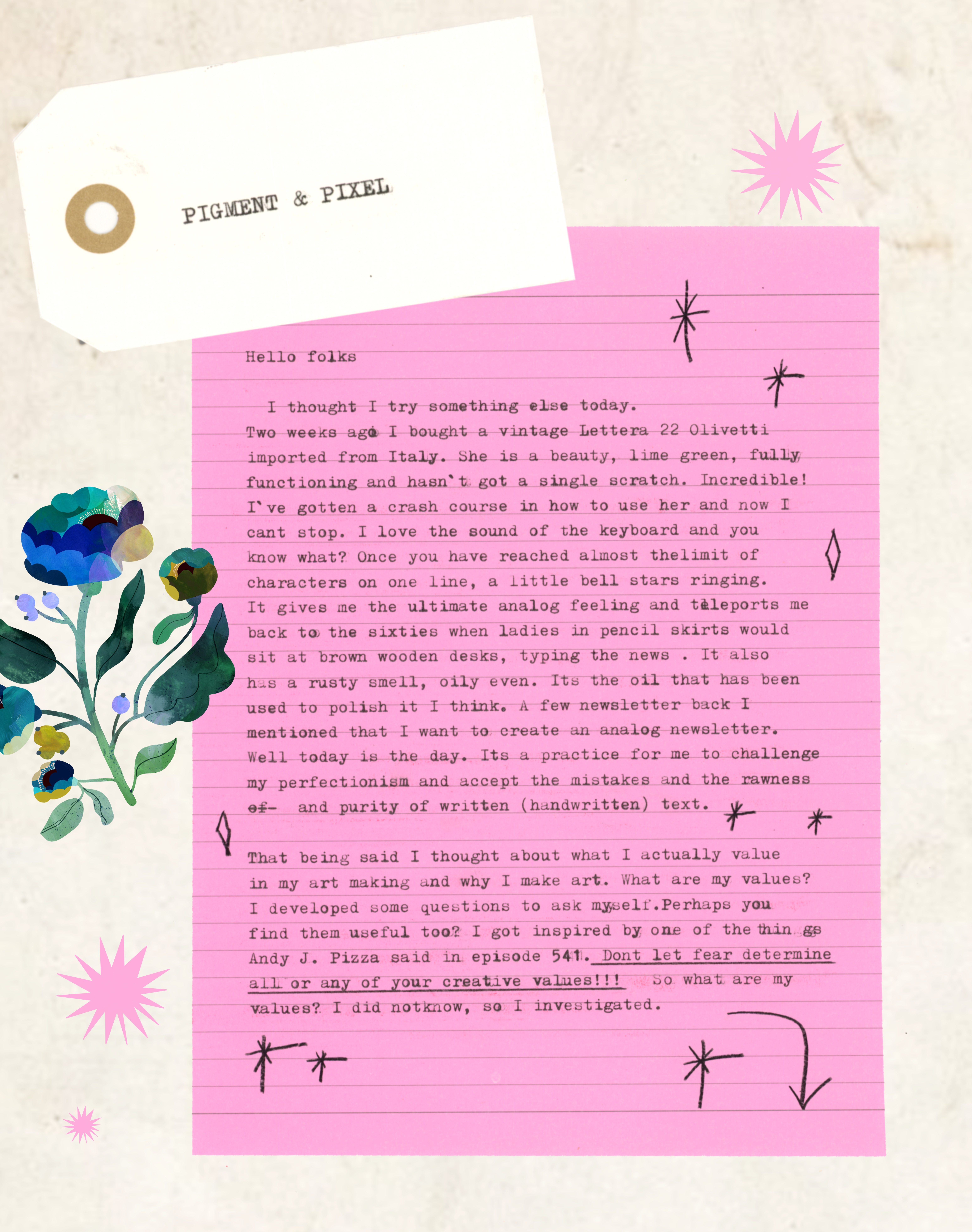 Thanks to Andy J. Pizza for the episode about not letting fear win and create as if no one is watching and Allie Sullberg for introducing how to make an analog newsletter and Estee Zales for showing us her version of the analog newsletter. Great ideas and great advice are meant to be shared.